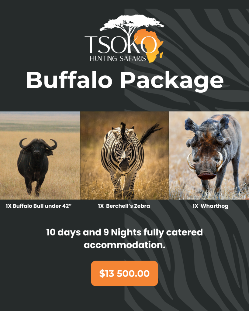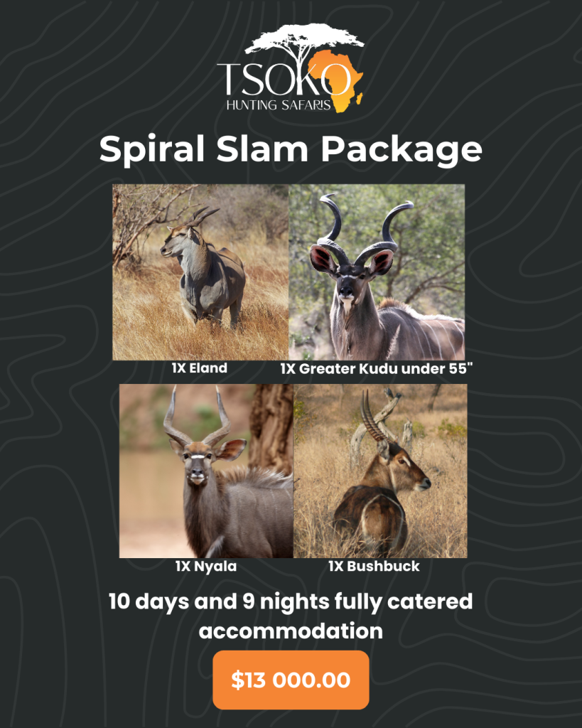 - In case of any trophy included in the package that is not hunted by the client, 50% of the specific animal value will be credited back to the client.